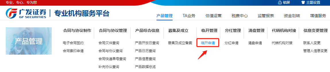 管理人于临时开放当天16:00前通过【专业机构服务平台】-【产品管理】模块,点击【临开申请】进入,按照要求填写并提交申请。