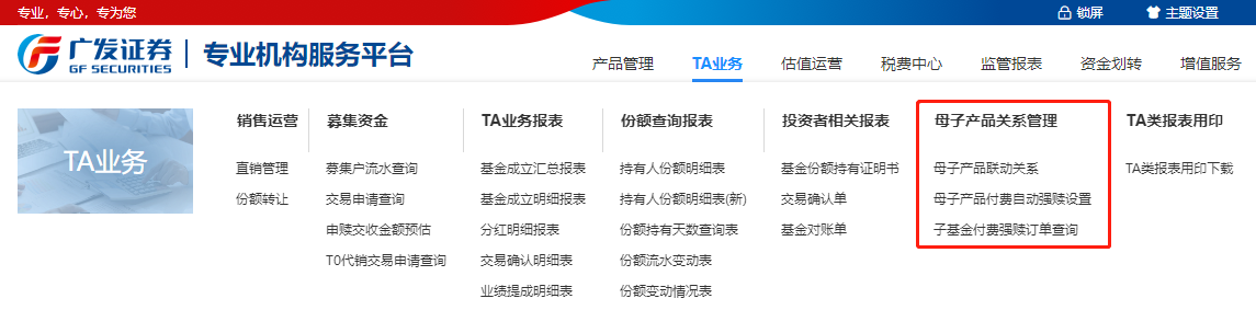(1)管理人登录专业机构服务平台,通过TA业务-母子产品关系管理-母子产品联动关系-新增申请,按系统页面提示选择母子产品完善授权信息后提交申请。