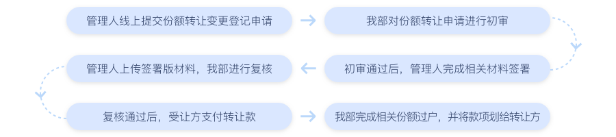 - 公司型、合伙型股权基金份额变更登记工作特别提醒:管理人应该在份额转让变更后及时完成工商登记变更相关手续。