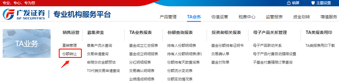 申请路径:管理人登录我部专业机构服务平台-TA业务-销售运营-份额转让,通过订单列表-创建订单,按系统提示完善信息后提交份额转让申请。