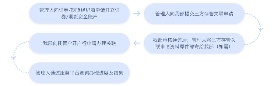 - 我部审核管理人申请材料无误后,将提交至托管户开户行办理三方存管关联。