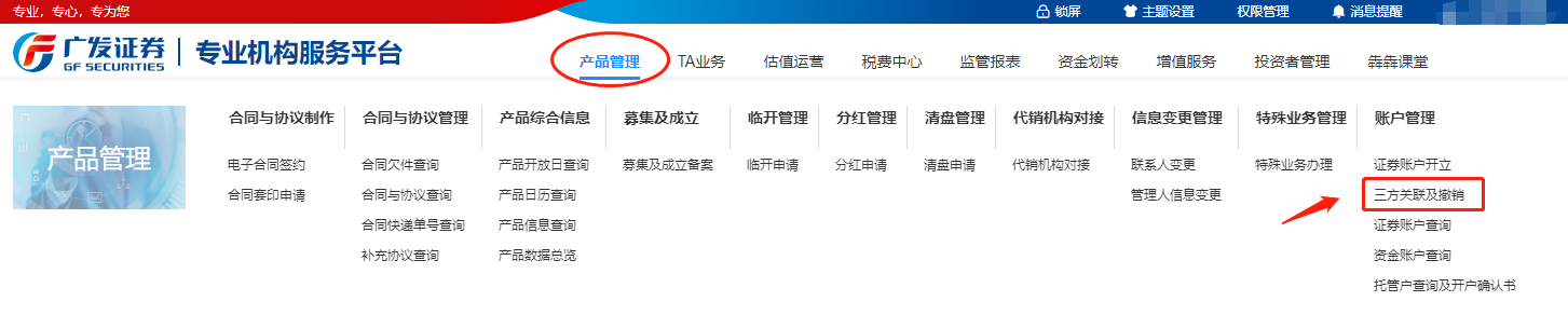 - 管理人可通过【专业机构服务平台】-【产品管理】-【账户管理】-【三方关联及撤销】路径查看流程状态。
