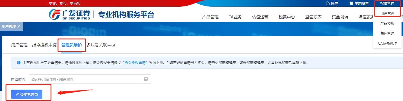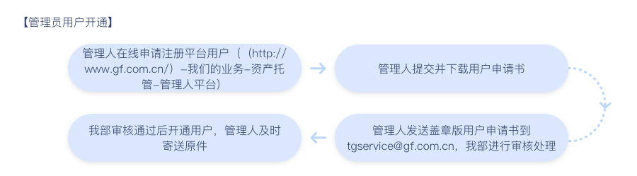管理人将《开通/变更广发证券专业机构服务平台用户申请书》的PDF版电子扫描件(分页加盖骑缝章;如为正反面打印,请每页盖章)发送至我部指定的信息接收邮箱:tgservice@gf.com.cn。原件寄送至我部,收件地址:广州市天河区马场路26号广发证券大厦34楼 资产托管部客服组收 020-66338782(如有业务咨询请联系95575-6)。