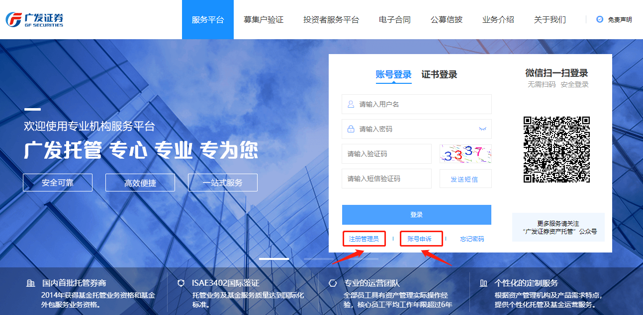如需对用户信息进行变更(包括用户姓名、电话、邮箱),通过广发官网(http://www.gf.com.cn/)-我们的业务-资产托管-管理人平台,打开服务平台登录页,点击【账号申诉】跳转至注册界面,准确填写变更后的用户信息,点击【下一步】,其余相关步骤参照签署管理用户开通流程办理即可。
