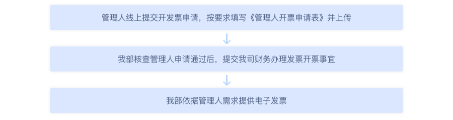 我部收到申请经审核通过后,提交我司财务部办理发票开票事宜,发票开具完毕及时推送至管理人发票接收邮箱。