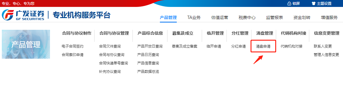 操作路径:【专业机构服务平台】-【产品管理】-【清盘申请】,管理人填写相关清盘信息后,系统生成清盘说明函-《产品合同终止与产品清算通知》,管理人在流程中上传附件,线上提交清盘申请。