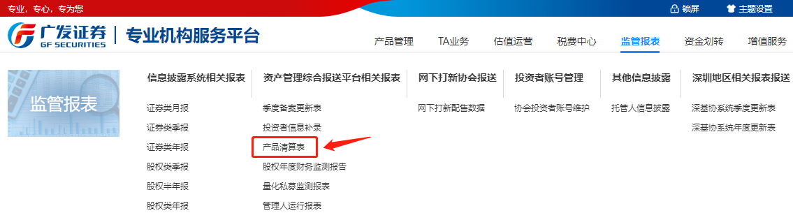 如产品外包在广发证券,则我部基金服务组会在产品清盘款从托管户划出后的3个工作日通过专业机构服务平台推送《私募基金产品清算表》供管理人完成在资产管理业务综合报送平台的清盘信息报备工作。(查阅及下载路径:专业机构服务平台-监管报表-资产管理业务综合报送平台相关报表-产品清算表)