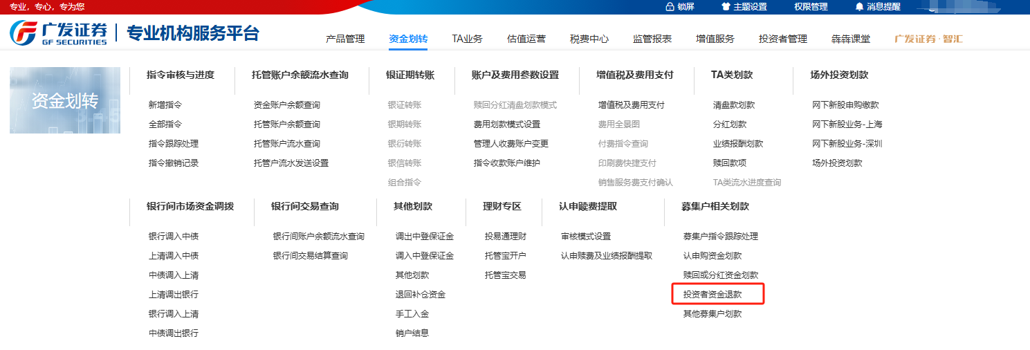【情形一】:管理人登录专业机构服务平台-资金划转-投资者资金退款,查询投资者打款流水,提交退款申请。(适用于投资者打款后,管理人没有提交认申购申请的情形;若管理人已录单,请先于录单当天17:00前退单后再提交投资者退款申请)。