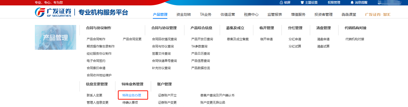 【情形二】:管理人登录专业机构服务平台-产品管理-特殊业务办理,业务类型选择交易确认失败,提交认购确认失败申请。(适用于管理人已提交投资者的认购申请,其交易已确认成功但产品未成立)。