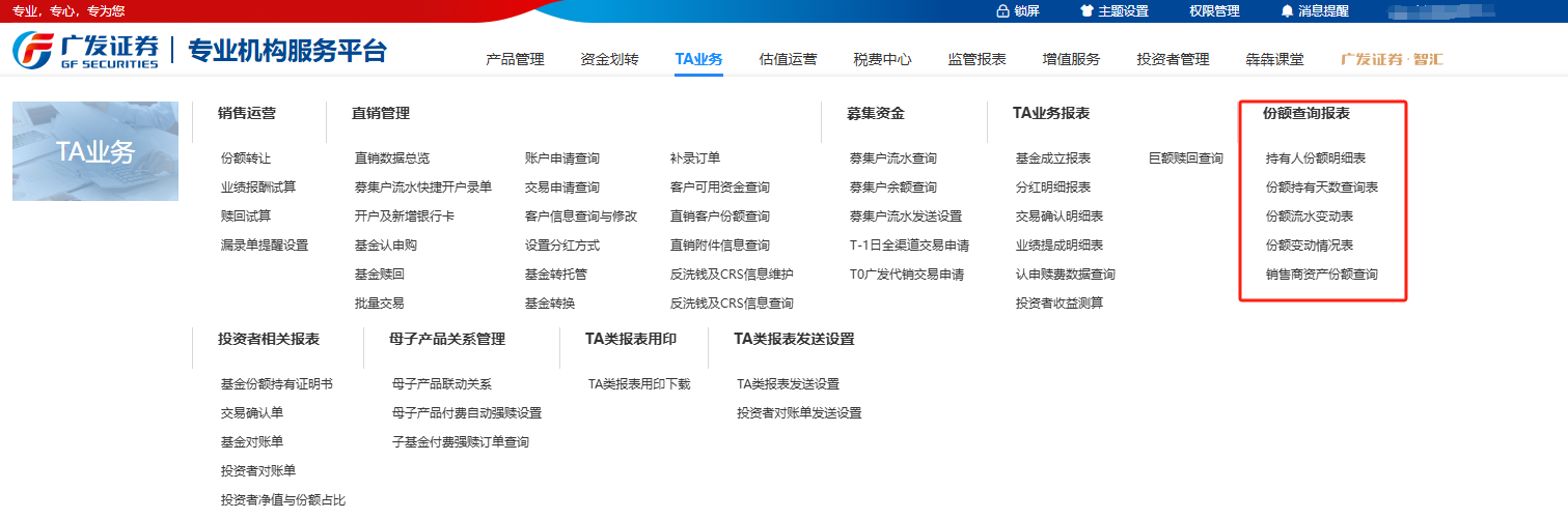 管理人可以通过【专业机构服务平台】-【TA业务】-【份额查询报表】查询产品份额情况,报表类型包括持有人份额明细表、份额持有天数查询表、份额流水变动表、份额变动情况表、销售商资产份额查询表等。