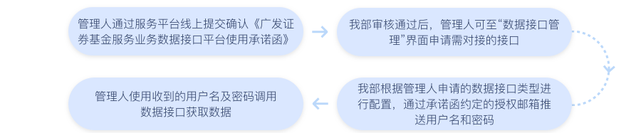 我部收到管理人的线上申请后,根据管理人选择确定的数据接口类型进行配置,完成后向管理人在《广发证券基金服务业务数据接口平台使用承诺函》中约定的授权邮箱推送数据接口对接用户名和密码。管理人收到后,即可使用相应用户及密码调用数据接口获取数据。具体的接口接入流程和接口描述请参阅《广发证券托管API数据接口文档》(文档不定期更新,下载路径:【专业机构服务平台】-【增值服务】-【下载中心】-【下载中心】-【产品/运营常用模板】)。