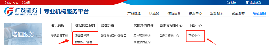为确认数据接口使用规范及数据安全,申请数据接口服务对接前,需管理人提交《广发证券基金服务业务数据接口平台使用承诺函》。该承诺函已经实现模板化部署管理,管理人通过专业机构服务平台线上确认、维护调用数据接口的用户信息接收邮箱、公网出口IP地址后直接提交。